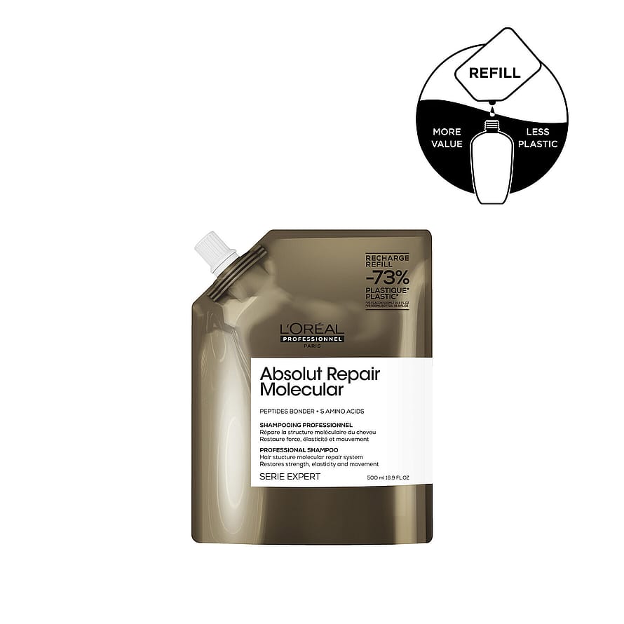 Ensimmäistä kertaa saatavilla täyttöpakkauksessa, jossa on 73 % vähemmän muovia kuin vastaavassa 500 ml:n pullossa, enemmän kestävän kehityksen mukainen pakkaus. [SUOSITELLAAN VAURIOITUNEILLE HIUKSILLE] Vaurioituneille hiuksille, värjätyille, vaalennetuille ja käsittelemättömille hiuksille. Korjaa 2 vuoden aikaisia vaurioita yhdellä käyttökerralla*. [TIETEELLINEN LÖYTÖ - KORJAUSTA MOLEKYYLITASOLLA] Kun hiuksiin tulee vaurioita, vaurioita tulee sen peptideistä koostuvaan molekyylirakenteeseen. Hiukset katkeilevat ja muuttuvat joustamattomiksi. Mutta useimmat peptidit ovat liian suuria päästäkseen hiuskuidun sisälle, mikä tekee vaurioista lähes peruuttamattomia. Tieteellinen löytö – Absolut Repair Molecular. [PATENTOITU TEKNOLOGIA] Tämä patentoidun teknologian shampoo, joka sisältää peptidisidosainetta + 5 aminohappoa, korjaa hiusten makromolekyylirakennetta*. *Instrumentaalinen testi hiuskuidun makromolekyylirakenteelle shampoon + pois huuhdeltavan seerumin + hiuksiin jätettävän voiteen käytön jälkeen.