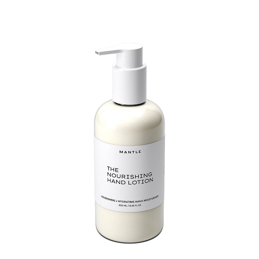 The Nourishing Hand Lotion on nopeasti imeytyvä käsivoide, joka antaa intensiivistä hoitoa ja kosteutusta. Koostumus sisältää kosteuttavaa hyaluronihappoa, ihon suojakerrosta vahvistavia ceramideja, pehmentävää sheavoita ja antioksidanttipitoista tyrniuutetta. Lopputuloksena pehmeät ja kosteutetut kädet. Voiteessa on MANTLEn raikas sitrustuoksu.