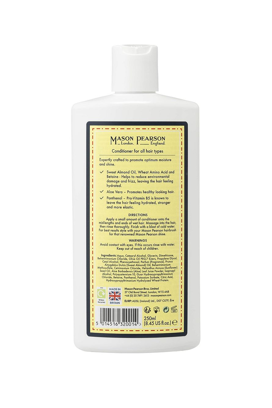 Mason Pearson Conditioner kaikille hiustyypeille on intensiivisesti ravitseva hoitoaine, joka on rikastettu manteliöljyllä, vehkeaminohapoilla, E-vitamiinilla, B5:llä ja aloe veralla saadakseen terveet, sileät ja kiiltävät hiukset. Koostumus on kehitetty jakamaan hiusten luonnolliset öljyt tasaisesti pituuksille, täydentäen täydellisesti maailmankuulujen hiusharjojen hierovaa vaikutusta.