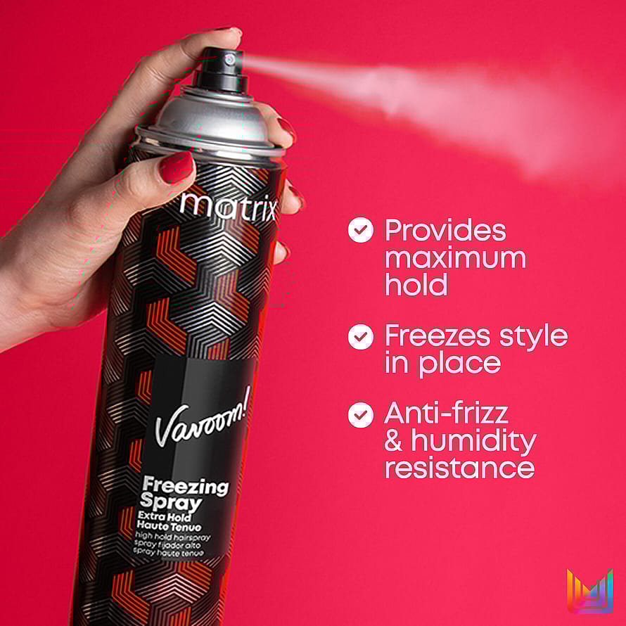 Matrix Vavoom Freezing Spray Extra Hold nopeasti kuivuva koostumus vahvalla pidolla, lukitsee välittömästi minkä tahansa kampauksen paikoilleen antaen samalla tuuheutta, rakennetta ja kohotusta. Matrix Vavoom Freezing Spray Extra Hold nopeasti kuivuva koostumus vahvalla pidolla lukitsee välittömästi minkä tahansa kampauksen paikoilleen antaen samalla tuuheutta, rakennetta ja kohotusta. Vavoom-sarjan Extra Hold tarjoaa maksimaalisen pidon ja voi lukita minkä tahansa kampauksen paikoilleen jopa 24 tunniksi!* Vavoom Extra Hold -hiuskiinne ei vain auta pitämään hiuksiasi paikoillaan, vaan se myös taistelee pörröisyyttä ja kosteutta vastaan ja pitää kampauksesi sileänä ja hallinnassa. Tämä voimakkaan pidon hiuskiinne sopii kaikille hiustyypeille, rakenteille ja kampauksille. *instrumentaalinen testi