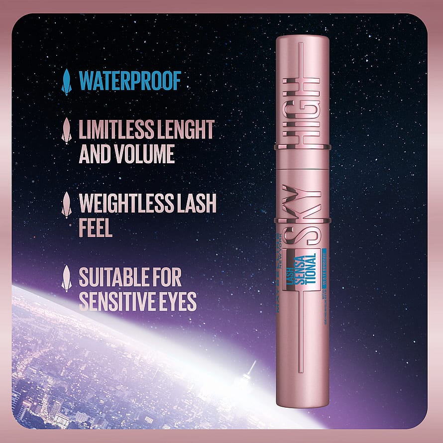 Maybelline Lash Sensational Sky High -maskara antaa ripsille taivaita hipovaa pituutta kaikista kulmista! Yhdistelmä runsasta tuuheutta ja loputonta pituutta. Pituutta antava maskara, joka sopii herkille silmille mustassa sävyssä. Kohottaa ja pidentää ripsiä ja antaa niille runsaasti tuuheutta. Pitkä, joustava maskaraharja antaa tuuheutta ja pituutta jokaiselle ripselle tyvestä kärkeen. Maybelline Lash Sensational Sky High -maskaran bambu-uutetta ja kuitua sisältävä koostumus antaa pitkät, tuuheat ripset, jotka tuntuvat keveiltä. Sopii herkille silmille. Helppo poistaa.