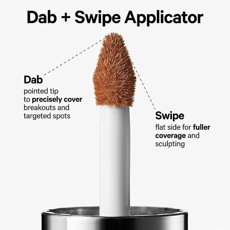 Peitä: -Peitä hyperpigmentaatio applikaattorin avulla ja kirkasta silmänympärysalue. Levitä ja häivytä! -Käytä kapenevaa päätä pienten alueiden, kuten näppyjen ja nenänpielten peittämiseen -Levitä suuremmalle alueelle litteällä puolella peittääksesi tummat silmänaluset ja tasoittaaksesi ihonsävyä -Häivytä sormin, siveltimellä tai meikkisienellä. Varjosta ja korosta: -Pehmeän varjostuksen luomiseksi valitse yksi sävy vaaleampi ja pari sävyä tummempi peitevoide -Levitä poskien alle, nenän sivuille ja hiusrajaan luonnollisen varjostuksen luomiseksi -Levitä vaaleampaa sävyä kasvojen korkeisiin kohtiin kohottavan efektin luomiseksi. Koko kasvoille: -Käytä kerrostettavaa koostumusta koko kasvoilla luonnollisen lopputuloksen saamiseksi.
