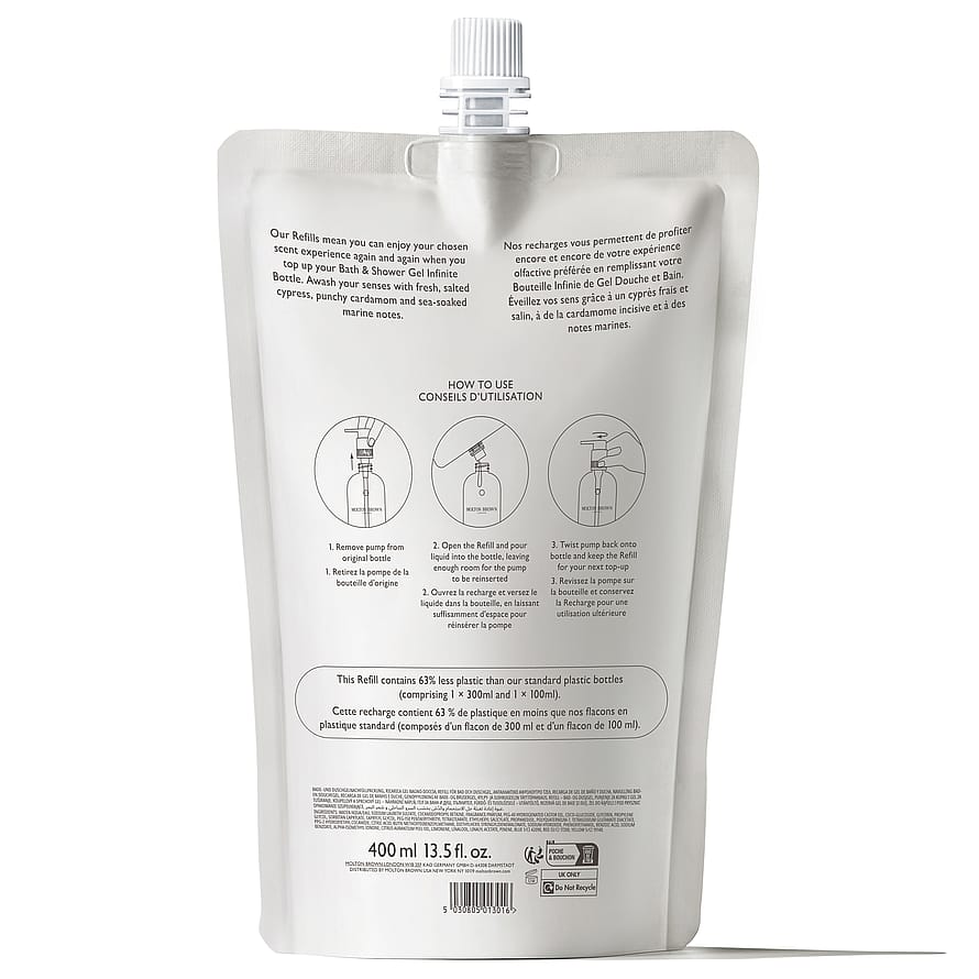 Uudelleentäyttöpakkaus. Molton Brown Coastal Cypress & Sea Fennel Bath & Shower Gel antaa kylpy- tai suihkurituaalillesi ripauksen merituulen tuoksuista ylellisyyttä. Virkistävä suihkugeeli sisältää merellisiä ja aromaattisia australialaisen merifenkolin ja suolaisen sypressin vivahteita. Se puhdistaa ihoa antaen sille ihanan tuoksun. Täytä olemassa oleva Molton Brown -pullo tällä uudelleentäyttöpakkauksella, joka sisältää 63 % vähemmän muovia kuin tavanomaiset pullot. Käytä yhdessä Molton Brown -vartaloemulsion kanssa saadaksesi täydellisen tuoksuelämyksen.
