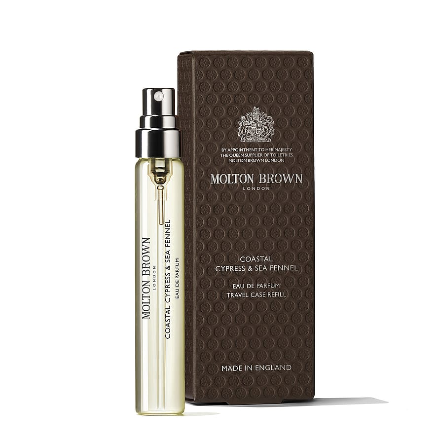 Molton Brown Coastal Cypress & Sea Fennel EdP Travel Case on raikas meren inspiroima Eau de Parfum. Se avautuu viikunanlehden ja inkiväärin aromaattisilla nuoteilla edeten sydäntuoksun merellisiin ja jasmiinin nuotteihin ja tuoden lopuksi esiin syvän ja täyteläisen pohjatuoksun nahkavivahteet.
