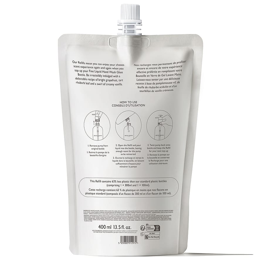 Molton Brown Delicious Rhubarb & Rose Fine Liquid Hand Wash Refill -uudelleentäyttöpakkauksella täytät Molton Brown -muovi- tai lasipullosi uudelleen. Virkistävä ja kosteuttava käsisaippua antaa ylellisen ja miellyttävän puhdistavan elämyksen. Sisältää eloisan raparperin, täyteläisen vaniljan ja raikkaan greipin vastustamattomia nuotteja. Käytä yhdessä yhteensopivan Molton Brown -käsiemulsion kanssa vahvistaaksesi virkistäviä ja eloisia tuoksunuotteja. Uudelleentäyttöpakkaus sisältää 63 % vähemmän muovia kuin tavalliset Molton Brown -pullot.