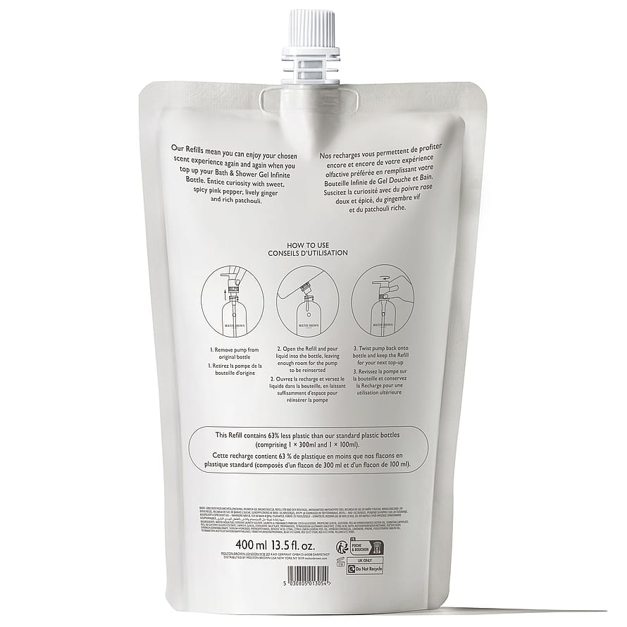 Refill. Molton Brown Fiery Pink Pepper Bath & Shower Gel antaa kylpy- ja suihkurituaalillesi ripauksen ylellisyyttä. Sisältää mausteisen roseepippurin, eloisan inkiväärin ja täyteläisen patsulin eloisia nuotteja. Aistillinen suihkugeeli puhdistaa ihon ja antaa sille ihanan tuoksun. Tällä uudelleentäyttöpakkauksella täytät Molton Brown -pullosi uudelleen. Sisältää 63 % vähemmän muovia kuin tavalliset Molton Brown -pullot. Käytä yhdessä yhteensopivan Molton Brown -vartaloemulsion kanssa viimeistelläksesi tuoksuelämyksen.