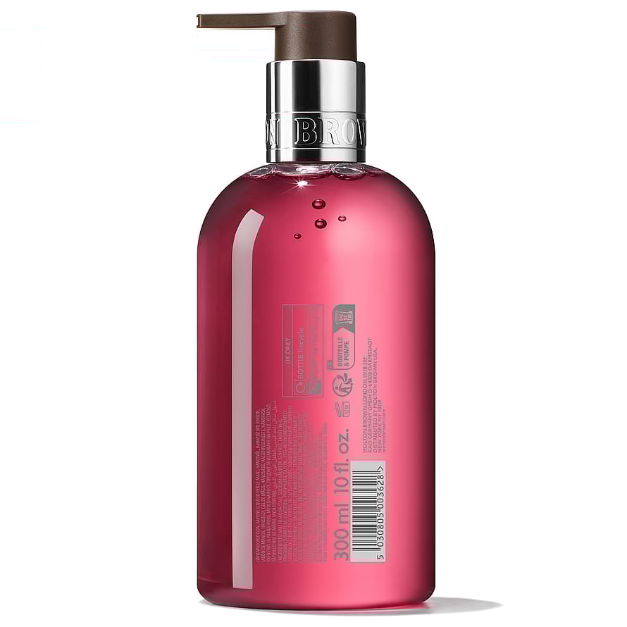 Molton Brown Fiery Pink Pepper Fine Liquid Hand Wash kosteuttava käsisaippua antaa ylellisen ja miellyttävän puhdistavan elämyksen. Sisältää mausteisen roseepippurin, lämpimän inkiväärin ja täyteläisen patsulin eloisia nuotteja antaen iholle virkistävän, aromaattisen tuoksun. Käytä yhdessä yhteensopivan Molton Brown -käsiemulsion kanssa vahvistaaksesi ihanaa puuvivahteista ja mausteista tuoksua.