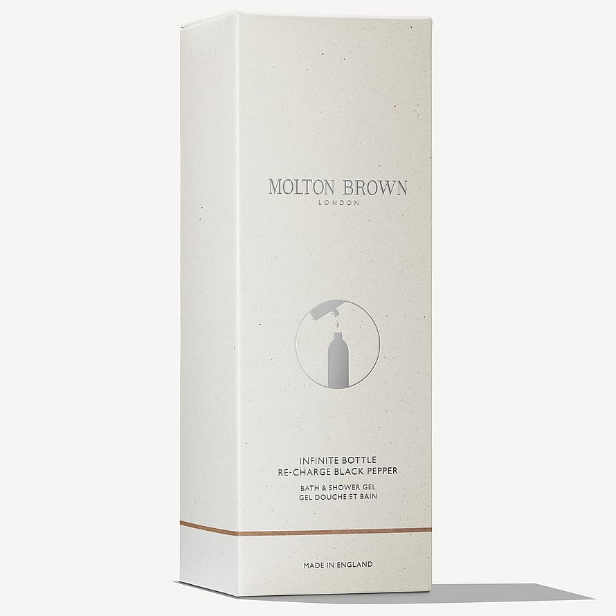 Molton Brown Infinite Bottle Re-Charge Black Pepper Bath & Shower Gel on ihana suihkusaippua vastuullisessa uudelleentäytettävässä pullossa, joka on valmistettu 100 % kierrätetystä alumiinista. Mausteisen mustapippurin, puuvivahteisen korianterin ja maanläheisen vetiverin lämpimiä nuotteja sisältävä aromaattinen suihkusaippua antaa kylpy- ja suihkurituaalillesi ripauksen ylellisyyttä, puhdistaa ihoa ja antaa sille ihanan tuoksun. Käytä yhdessä yhteensopivan Molton Brown -vartaloemulsion kanssa viimeistelläksesi tuoksuelämyksen.