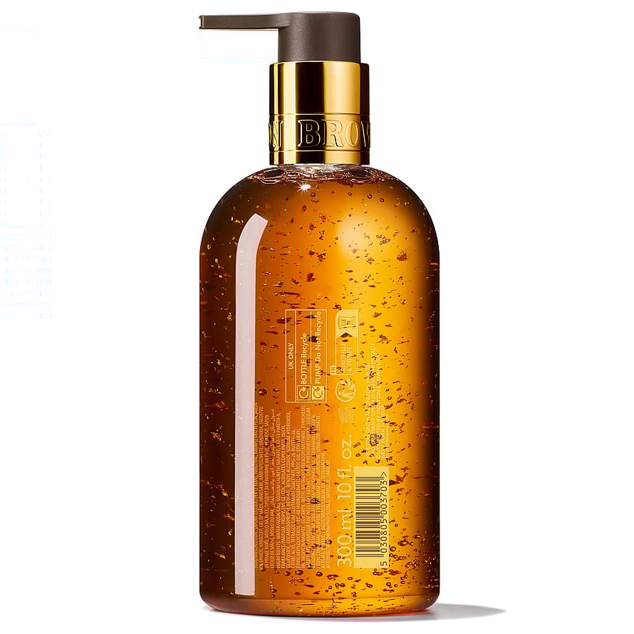 Molton Brown Mesmerising Oudh Accord & Gold Fine Liquid Hand Wash virkistävä käsisaippua antaa ylellisen ja miellyttävän puhdistavan elämyksen. Sisältää raikkaan bergamotin, savuisen mustan teen ja hunajaisen hartsin täyteläisiä nuotteja. Puhdistaa, kosteuttaa ja antaa iholle virkistävän aromaattisen tuoksun. Käytä yhdessä yhteensopivan Molton Brown -käsiemulsion kanssa vahvistaaksesi täyteläistä, lämmintä tuoksua.