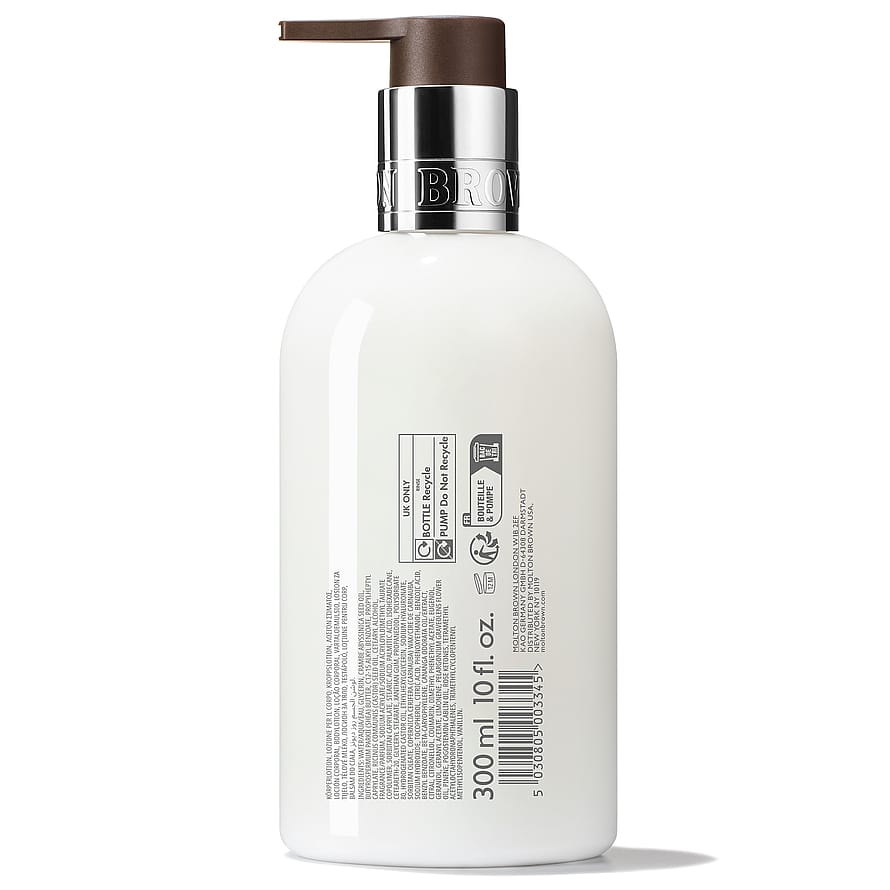 Molton Brown Rose Dunes Body Lotion kosteuttava ja ravitseva vartaloemulsio sisältää kirpeiden mustaviinimarjojen, lämpimien ruusujen ja maanläheisen patsulin vietteleviä nuotteja. Nopeasti imeytyvät öljyt tekevät ihosta silkinpehmeän ilman tahmaista tunnetta – täydellisen ylellinen tunne suihkun jälkeen. Käytä yhdessä yhteensopivan Molton Brown -suihkugeelin kanssa vahvistaaksesi ihanan aromaattista tuoksua.