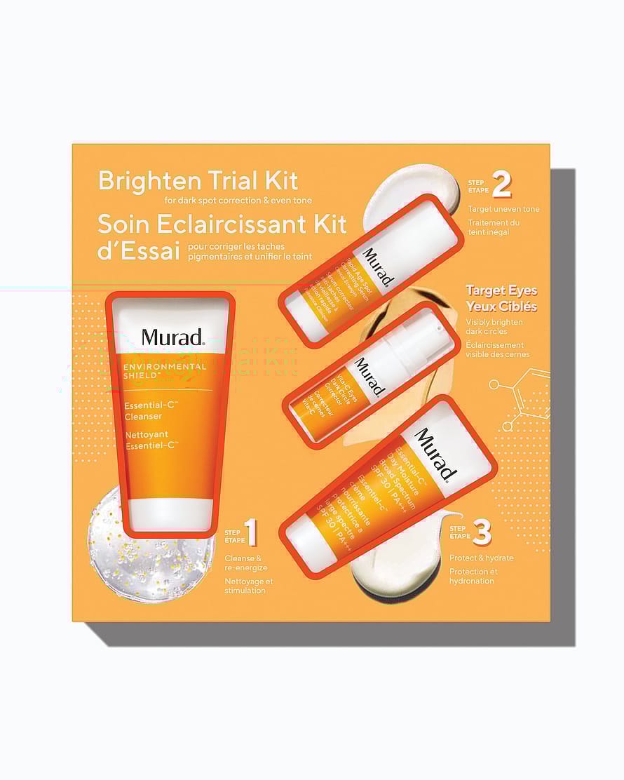 Essential C cleanser: Water/Aqua/Eau, Cocamidopropyl Betaine, Disodium Laureth Sulfosuccinate, Glycerin, Butylene Glycol, Aminomethyl Propanol, Polysorbate 20, Acrylates/C10-30 Alkyl Acrylate Crosspolymer, Panthenol, Phospholipids, Tocopheryl Acetate, Retinyl Palmitate, Ascorbyl Palmitate, Ascorbic Acid, Chitosan, Rice Amino Acids, Zinc Aspartate, Allantoin, Sodium PCA, Lactose, Cellulose, Hydroxypropyl Methylcellulose, Propyl Gallate, Disodium EDTA, Phenoxyethanol, Caprylyl Glycol, Chlorphenesin, Limonene, Linalool, Citrus Aurantium Dulcis (Orange) Oil, Citrus Nobilis (Mandarin Orange) Peel Oil, Ocimum Basilicum (Basil) Oil, Citrus Grandis (Grapefruit) Peel Oil, Ferula Galbaniflua (Galbanum) Resin Oil, Fragrance (Parfum), Iron Oxides (CI 77492) Vita-C Glycolic Brightening Serum: Water/Aqua/Eau, Glycerin, Caprylic/Capric Triglyceride, Glycolic Acid, Dimethicone, Sodium Hydroxide, HDI/Trimethylol Hexyllactone Crosspolymer, Diisopropyl Sebacate, C13-16 Isoparaffin, Polyacrylate Crosspolymer-6, Dimethyl Isosorbide, Ascorbic Acid, Urea, Yeast Amino Acids, Trehalose, Inositol, Taurine, Betaine, Glutathione, Tetrahexyldecyl Ascorbate, Cetearyl Isononanoate, Hydroxyethyl Acrylate/Sodium Acryloyldimethyl Taurate Copolymer, Oleyl Alcohol, Silica, Hexylresorcinol, Polysilicone-11, Triheptanoin, Polyisobutene, Marrubium Vulgare Extract, Zanthoxylum Bungeanum Fruit Extract, Verbascum Thapsus Extract, Tocopherol, Butylene Glycol, Mica, Hexylene Glycol, Sodium Surfactin, Xymenynic Acid, Tocopheryl Acetate, PEG-7 Trimethylolpropane Coconut Ether, Terminalia Ferdinandiana Fruit Extract, Sorbitol, Tin Oxide, Xanthan Gum, t-Butyl Alcohol, Chlorella Vulgaris Extract, Decyl Glucoside, Gold, Citric Acid, Caprylyl Glycol, Phenoxyethanol, Ethylhexylglycerin, Sodium Benzoate, Potassium Sorbate, 1, 2-Hexanediol, Lactic Acid, Propanediol, Sorbitan Isostearate, Titanium Dioxide (CI 77891) Essential – C Day SPF 30: Water/Aqua/Eau, Ethylhexyl Methoxycinnamate, Homosalate, Ethylhexyl Salicylate, Butyl Methoxydibenzoylmethane, Butylene Glycol, Stearic Acid, Benzophenone-3, Diisopropyl Sebacate, Cocoglycerides, Lauryl Lactate, Glyceryl Stearate, PEG-100 Stearate, Isodecyl Neopentanoate, Dimethicone, Cetyl Alcohol, Cetyl Phosphate, Urea, Yeast Amino Acids, Trehalose, Inositol, Taurine, Betaine, Phospholipids, Retinyl Palmitate, Tocopheryl Acetate, Ascorbyl Palmitate, Pelvetia Canaliculata Extract, Ectoin, Ginkgo Biloba Leaf Extract, Vitis Vinifera (Grape) Seed Extract, Passiflora Incarnata Extract, Tetrahexyldecyl Ascorbate, Sodium PCA, Panthenol, Tripleurospermum Maritimum Extract, Zinc Gluconate, Ethyl Linoleate, Magnesium Aluminum Silicate, Xanthan Gum, Aminomethyl Propanol, Disodium EDTA, Phenoxyethanol, Caprylyl Glycol, Chlorphenesin, Limonene, Linalool, Fragrance (Parfum), Yellow 6 (CI 15985), Red 33 (CI 17200) Vita-C Eyes Dark Circle Corrector: Water/Aqua/Eau, Glycerin, Dimethicone, Hydroxyethyl Acrylate/Sodium Acryloyldimethyl Taurate Copolymer, Titanium Dioxide (CI 77891), Niacinamide, Ascorbic Acid, Urea, Yeast Amino Acids, Trehalose, Inositol, Taurine, Betaine, Glutathione, Tetrahexyldecyl Ascorbate, Glucosyl Hesperidin, Fucus Vesiculusus Extract, Xymenynic Acid, HDI/Trimethylol Hexyllactone Crosspolymer, Mica, Triheptanoin, Propylene Glycol Dicaprate, Sorbitol, Helianthus Annuus (Sunflower) Seed Extract, C13-16 Isoparaffin, Caprylic/Capric Triglyceride, Polyisobutene, Silica, Tin Oxide, Hexylene Glycol, PEG-7 Trimethylolpropane Coconut Ether, Acetyl Zingerone, Asparagospsis Armata Extract, Chlorella Vulgaris Extract, Terminalia Ferdinandiana Fruit Extract, Hordeum Vulgare (Barley) Extract, Ascophyllum Nodosum Extract, Sodium Hyaluronate, Xanthan Gum, Cucumis Sativus (Cucumber) Extract, Trimethylsiloxysilicate, PEG-8 Methyl Ether Triethoxysilane, Gold, Caprylyl Glycol, Phenoxyethanol, Ethylhexylglycerin, Iron Oxides (CI 77492), Iron Oxides (CI 77491)