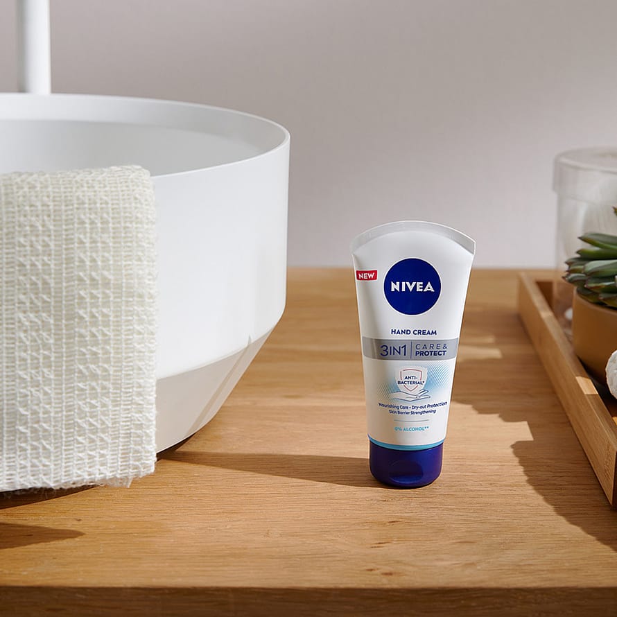 NIVEA 3in1 Care & Protect Anti-Bacterial Hand Cream -käsivoide auttaa pitämään kätesi kosteutettuina samalla kun se suojaa ihoasi haitallisilta bakteereilta. Dermatologisesti testattu, alkoholiton ja antibakteerinen koostumus sisältää ravitsevaa jojobaöljyä. Ravitsee käsiä tehokkaasti samalla vahvistaen ihon omaa suojakerrosta. Voide suojaa käsiä kuivumiselta ja auttaa vähentämään jatkuvan käsienpesun aiheuttamaa ihoärsytystä. Eliminoi haitallisia bakteereja iholta. Nopeasti imeytyvä, miellyttävän tuoksuinen voide jättää kädet pehmeiksi ilman rasvaista tunnetta iholla.