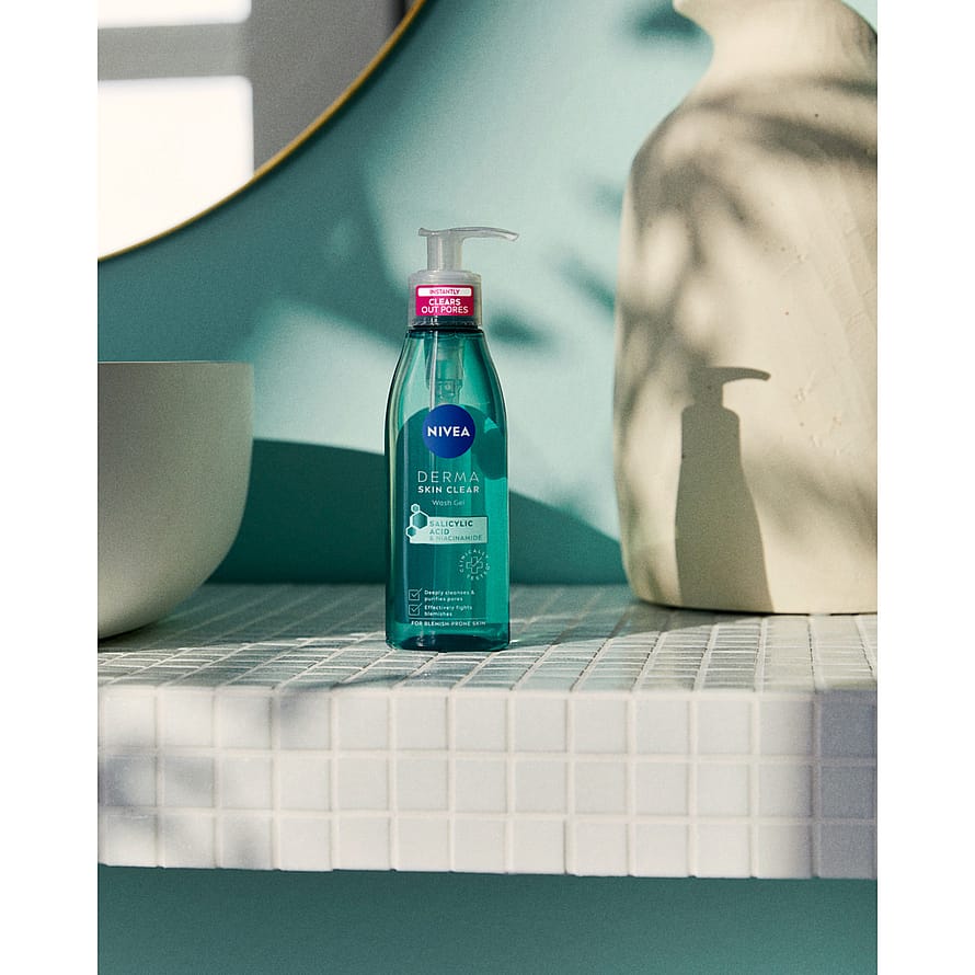 NIVEA Derma Skin Clear Anti-Blemish Wash Gel -kasvojenpuhdistusgeeli, kehitetty erityisesti epäpuhtaalle iholle. Sisältää salisyylihappoa ja niasiiniamidia. Syväpuhdistaa ihon, puhdistaa ihohuokoset ja poistaa ylimääräistä öljyä iholta. Vähentää epäpuhtauksia ja ennaltaehkäisee niiden syntymistä. Puhdistusgeeli tekee ihosta kauniin puhtaan näköisen. Vegaaninen koostumus.