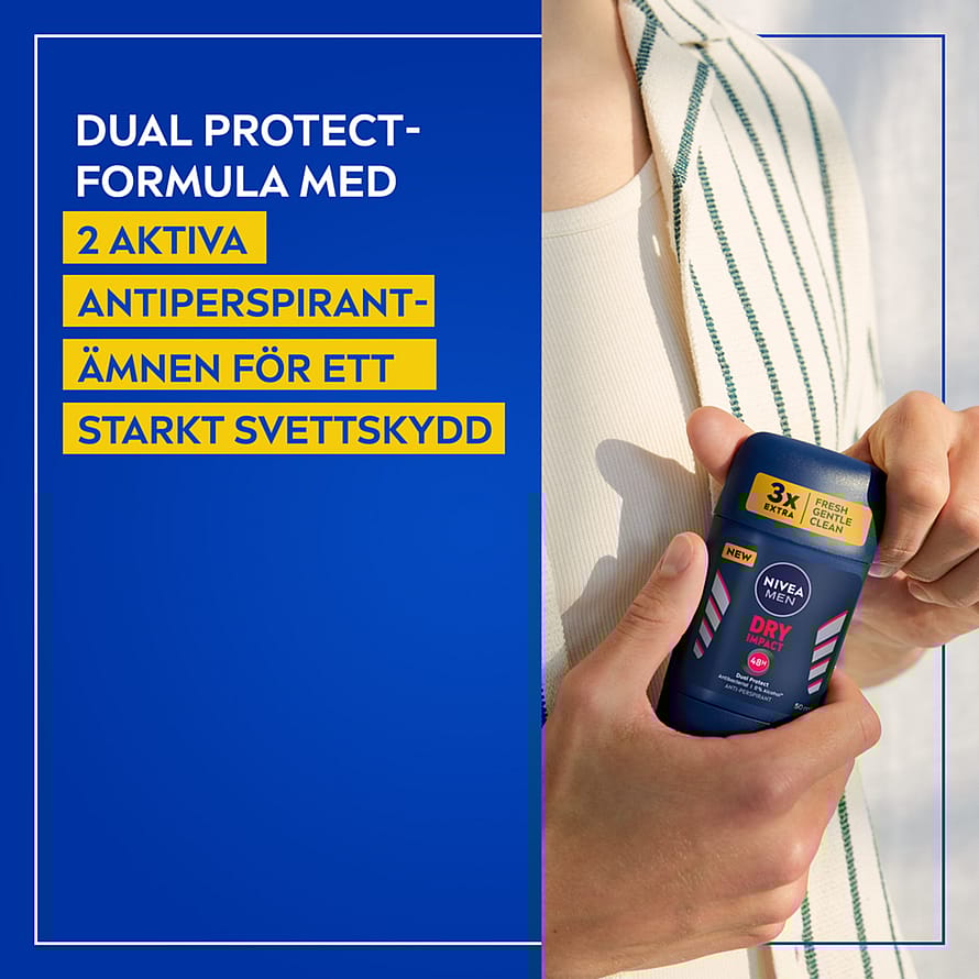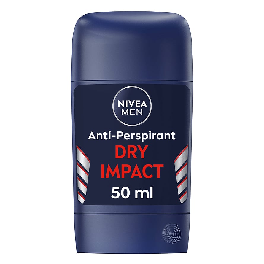 NIVEA MEN Dry Impact Stick -antiperspirantti antaa tehokkaan ja luotettavan suojan hikoilua vastaan jopa 48 tunniksi. Varmistaa miellyttävän kuivan olon koko päiväksi, ei märkiä kainaloita, ei hienhajua. Sisältää kaksi aktiivista antiperspiranttiainesosaa, jotka varmistavat itsevarman ja kuivan tunteen koko päiväksi. Hellävarainen, hoitava koostumus. Miellyttävä, maskuliininen tuoksu.