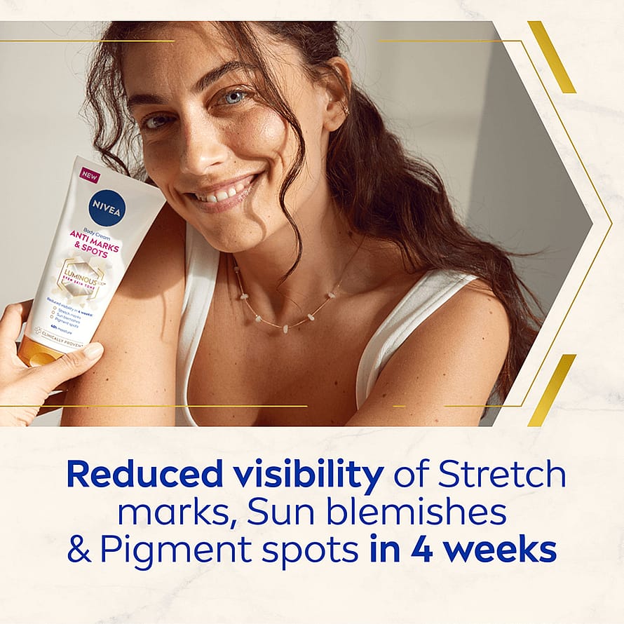 NIVEA Luminous630 Anti Marks & Spots Body Cream -vartalovoiteen hoitava, ihonsävyä tasoittava koostumus sisältää patentoitua LUMINOUS630®-ainesosaa. Voide tasoittaa ihonsävyn epätasaisuuksia vähentääkseen raskausarpien ja pigmenttiläiskien näkyvyyttä. Hoitaa ihoa ja tekee siitä ihanan pehmeän ja tasaisen. Kosteuttaa ihoa tehokkaasti 48 tunnin ajan.