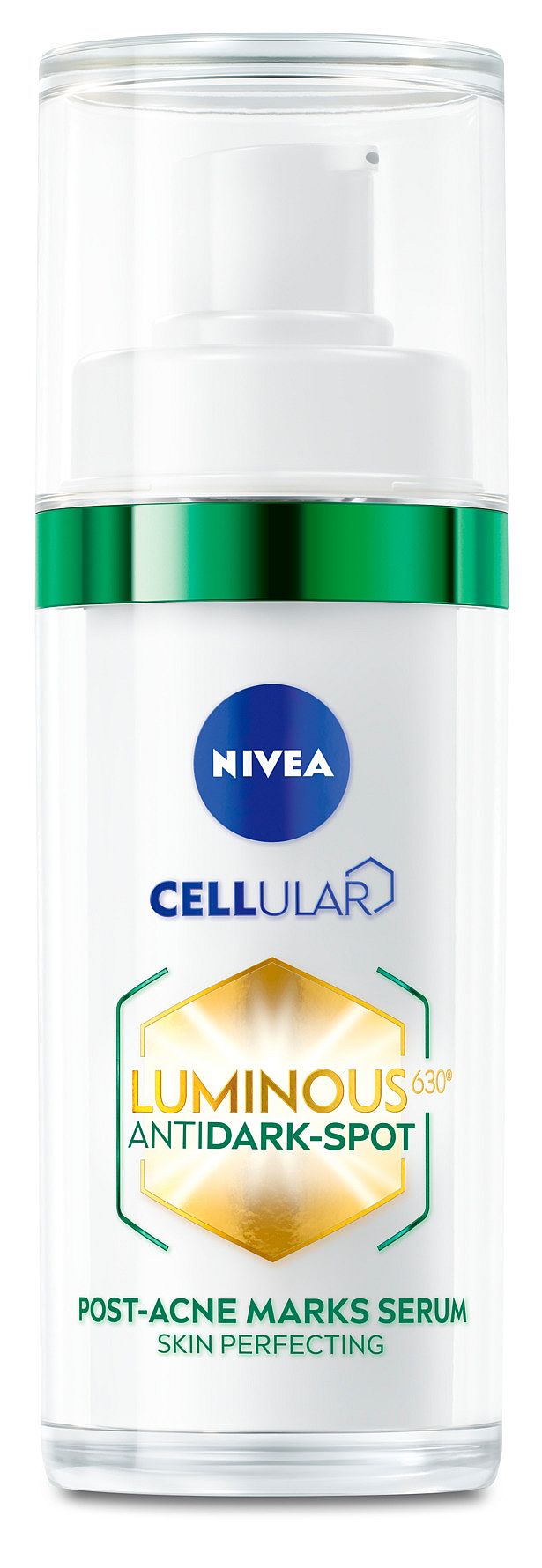 NIVEA Cellular Luminous 630 Post-Acne Marks -seerumi on kehitetty erityisesti sekaihon, öljyisen ihon ja epäpuhtaan ihon tarpeisiin. Koostumus sisältää: