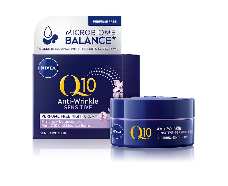 Herkälle, punoittavalle iholle kehitetty NIVEA Q10 Sensitive Perfume Free Night Cream -yövoide kosteuttaa, vähentää ryppyjä ja rauhoittaa ihoa. Se sisältää Q10:ä, luonnollista antioksidanttia, joka on 100% identtinen ihon oman Q10:n kanssa. Fermentointiprosessilla valmistettu puhdas Q10 toimii täydellisessä harmoniassa ihosi kanssa. Q10:n lisäksi tämä hajusteeton yövoide sisältää ihon punoitusta rauhoittavaa lakritsijuuriuutetta ja vähentää tehokkaasti herkän ihon kolmea tavallisinta oiretta: kuivuutta, kireyttä ja punoitusta. Tehokkaasti hoitava koostumus uudistaa ihoa yön aikana – jolloin iho parhaiten vastaanottaa kosteutusta.