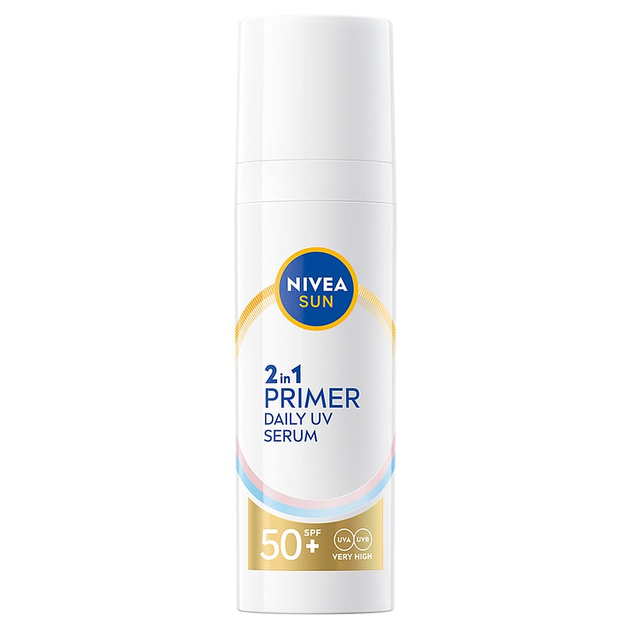 NIVEA SUN 2in1 Primer Daily UV Serum SK 50+ - kevyt aurinkosuojaseerumi yhdistää aurinkosuojan hyaluronihapon ja Licochalcone A:n kanssa, tehden ihosta terveen näköisen ja huomattavan pehmeän. Kehitetty erityisesti suojaamaan ja silottamaan kasvojen ihoa välittömästi. Innovatiivinen aurinkosuojaseerumi suojaa ihoa UVA/UVB-säteiltä ja sinivalon (HEV) vaikutuksilta, kuten ihon ennenaikaiselta vanhenemiselta. Koostumus sisältää kahta erityypistä hyaluronihappoa sekä Licochalcone A:ta, joka on voimakas antioksidantti. Pitkäketjuinen hyaluronihappo kosteuttaa ihon ylempiä kerroksia, kun taas lyhytketjuinen hyaluronihappo imeytyy syvemmälle ihoon ja stimuloi sen luonnollista hyaluronihapontuotantoa (in vitro). Lisäksi Licochalcone A aktivoi ihon omaa puolustusmekanismia ja suojaa ihosoluja oksidatiiviselta stressiltä. Kevyt, nopeasti imeytyvä seerumi ei jätä iholle tahmaista tunnetta tai valkoisia jäämiä. Tekee ihosta tasaisen ja huomattavan sileän, sopii erinomaisesti meikin alle. Ihanteellinen jokapäiväiseen käyttöön.