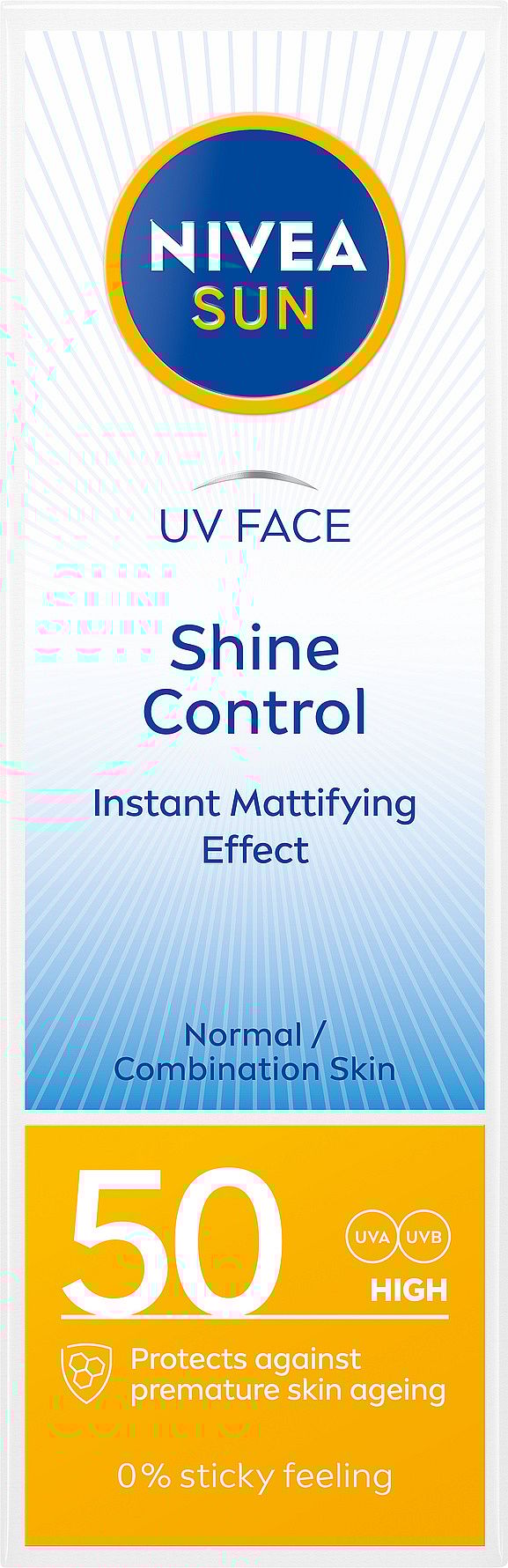 NIVEA SUN UV Face Shine Control Cream SK 50 -aurinkosuojavoide on erityisesti kasvoille kehitetty korkean ja tehokkaan suojan sisältävä aurinkosuojavoide. Se suojaa ihoa ulkoapäin UVA/UVB-säteiltä ja sinivalolta, jotka aiheuttavat ihovaurioita ja ihon ennenaikaista vanhenemista. Aurinkovoide suojaa ihoa myös sisältäpäin lakritsiuutteen ansiosta. Tämä voimakas luonnollinen antioksidantti aktivoi ihon omaa puolustusmekanismia. Voide antaa välittömän suojan UVA- ja UVB-säteilytä vastaan ja suojaa kasvojen ihoa auringolta vähentäen samalla ihon pinnan ylimääräistä öljyä ja hilliten ihon kiiltoa. Tekee ihosta ihanan mattapintaisen ja sopii hyvin meikin alle. Suojakerroin 50.