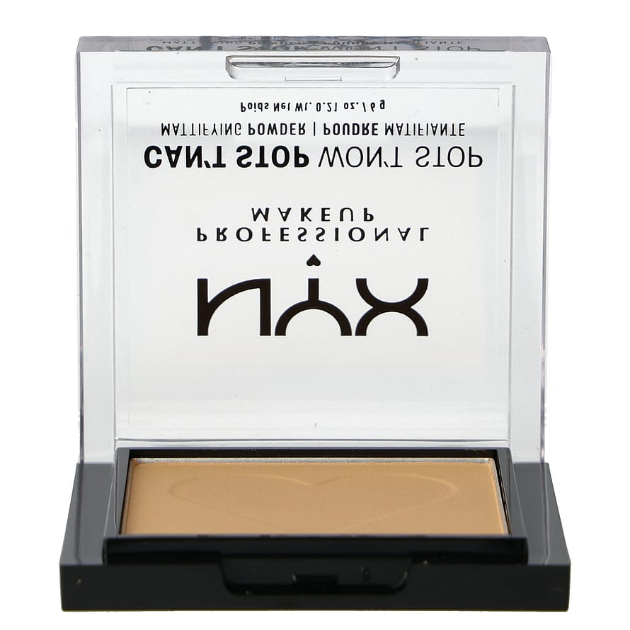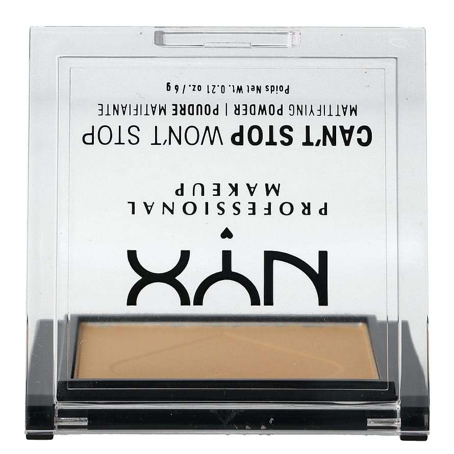 NYX Professional Makeup Can't Stop Won't Stop Mattifying Powder -puuteri antaa iholle välittömästi mattapintaisen lopputuloksen ja hillitsee ihon kiiltoa ja rasvaisuutta. Kevyt, vegaaninen koostumus* antaa iholle tasaisen, matan lopputuloksen näyttämättä kuivalta, kakkumaiselta tai tunkkaiselta. Läpikuultavat, kerrostettavat sävyt sulautuvat helposti iholle asettumatta pieniin juonteisiin ja antavat tasaisen, sileän lopputuloksen. Mattapuuteri pidentää meikkivoiteen kestoa ja mattapintaa tahraamatta, leviämättä ja muuttumatta! Puuteri hillitsee ihon kiiltoa koko päivän ja antaa erittäin mattapintaisen lopputuloksen, joka ei vaadi korjailua päivän mittaan.