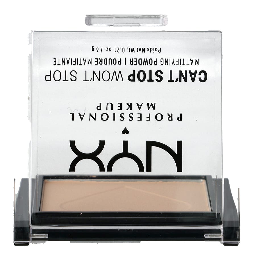 NYX Professional Makeup Can't Stop Won't Stop Mattifying Powder -puuteri antaa iholle välittömästi mattapintaisen lopputuloksen ja hillitsee ihon kiiltoa ja rasvaisuutta. Kevyt, vegaaninen koostumus* antaa iholle tasaisen, matan lopputuloksen näyttämättä kuivalta, kakkumaiselta tai tunkkaiselta. Läpikuultavat, kerrostettavat sävyt sulautuvat helposti iholle asettumatta pieniin juonteisiin ja antavat tasaisen, sileän lopputuloksen. Mattapuuteri pidentää meikkivoiteen kestoa ja mattapintaa tahraamatta, leviämättä ja muuttumatta! Puuteri hillitsee ihon kiiltoa koko päivän ja antaa erittäin mattapintaisen lopputuloksen, joka ei vaadi korjailua päivän mittaan.
