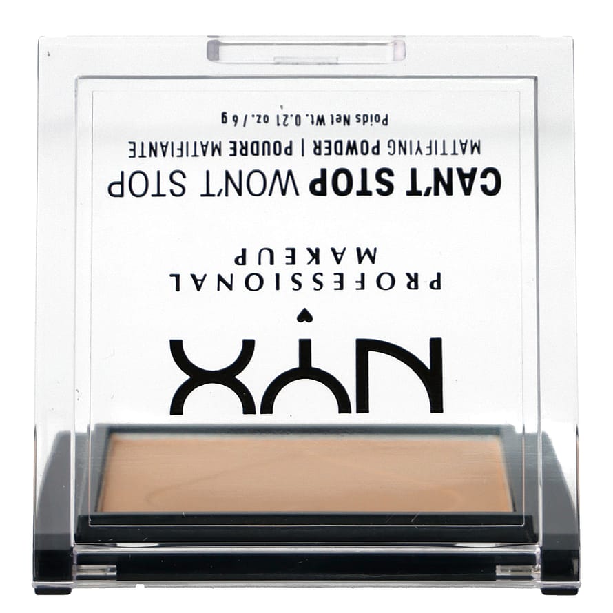 NYX Professional Makeup Can't Stop Won't Stop Mattifying Powder -puuteri antaa iholle välittömästi mattapintaisen lopputuloksen ja hillitsee ihon kiiltoa ja rasvaisuutta. Kevyt, vegaaninen koostumus* antaa iholle tasaisen, matan lopputuloksen näyttämättä kuivalta, kakkumaiselta tai tunkkaiselta. Läpikuultavat, kerrostettavat sävyt sulautuvat helposti iholle asettumatta pieniin juonteisiin ja antavat tasaisen, sileän lopputuloksen. Mattapuuteri pidentää meikkivoiteen kestoa ja mattapintaa tahraamatta, leviämättä ja muuttumatta! Puuteri hillitsee ihon kiiltoa koko päivän ja antaa erittäin mattapintaisen lopputuloksen, joka ei vaadi korjailua päivän mittaan.