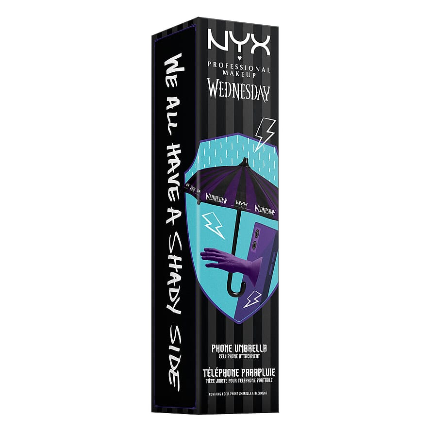 Minikokoinen sateenvarjo, joka kiinnitetään puhelimen tai tabletin taakse. Mobiililisävaruste, joka on saanut inspiraationsa Wednesdayn ikonisesta, violetista sateenvarjosta – käytännöllinen lisävaruste, joka ei jää huomaamatta. Lisää ripaus synkkää glamouria puhelimeesi ja suojaa samalla näyttöä kovalta todellisuudelta: auringonpaisteelta, sateelta tai huonolta valaistukselta. Maksimaalinen varjo näytöllesi, täydellinen valo pelottavan kauniisiin selfieihin. Oivallinen lisävaruste alakuloisen estetiikan ylläpitämiseen.