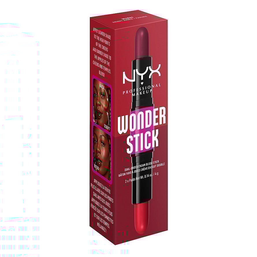 NYX Professional Makeup esittelee Wonder Stick kaksipäisen poskipunapuikon. Ensimmäinen kaksipäinen poskipunapuikkomme. Antaa väriä ja muotoilee kahdella helpolla askeleella. Anna kasvoillesi eloa hyaluronihappoa sisältävillä koostumuksilla kirkkaissa punaisissa sävyissä. Aloita levittämällä tummempaa sävyä antamaan muotoa kasvoillesi. Levitä sen jälkeen vaaleampaa sävyä poskipäillesi. Jos haluat luonnollisemman näköisen lopputuloksen, voit käyttää vain yhtä sävyä. Luonnollinen vai glam-look? Luo oma lookisi! Vegaaninen koostumus*.
