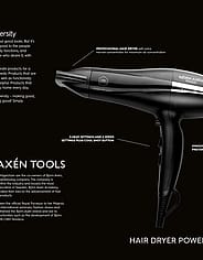 Ammattilaistason kompakti hiustenkuivain, jossa AC-moottori ja ilmankeskitin. Ionikäsittely vähentää hiusten sähköisyyttä. Kolme lämpöasentoa, kaksi puhallusvoimakkuutta sekä kylmäpuhallus. Irrotettava suodatin helpottaa puhdistusta. Erittäin pitkä liitosjohto 2,8 m. 2000 W.