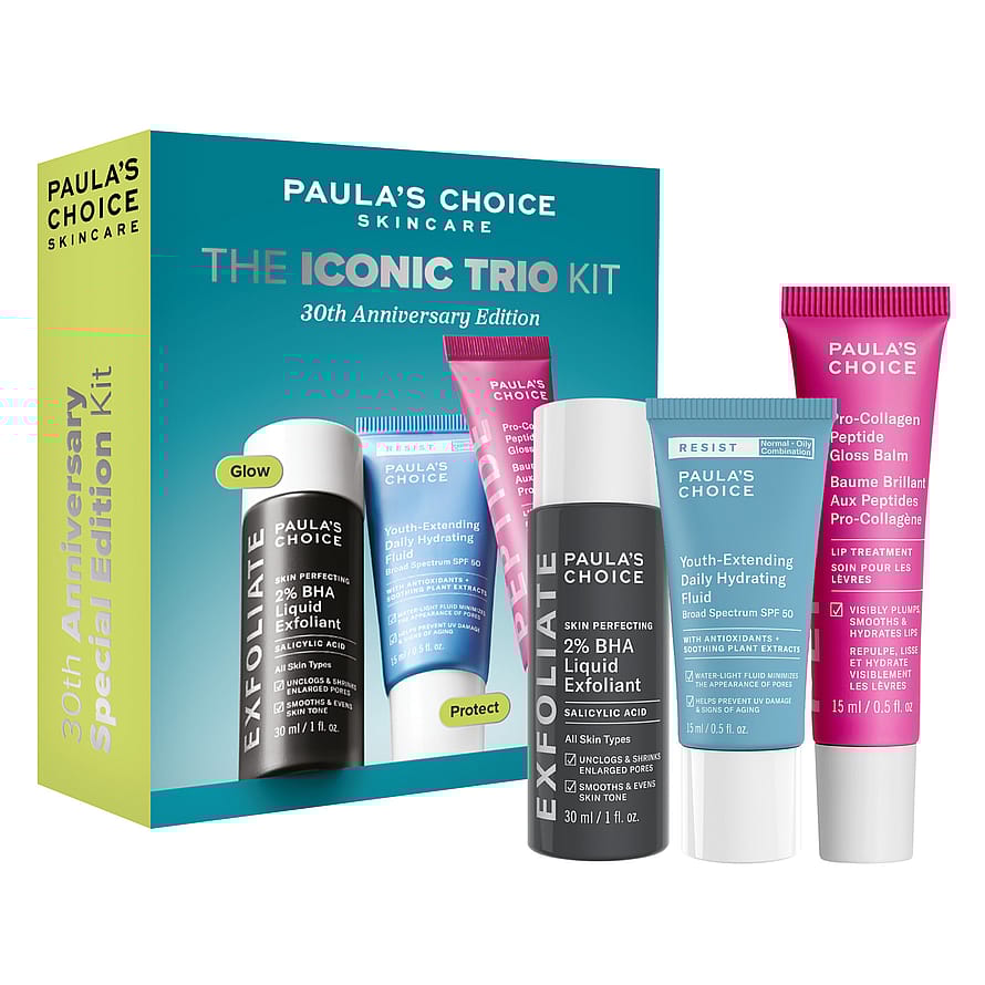 Juhli Paula's Choicen 30-vuotispäivää! Tämä Anniversary Edition -setti sisältää kolme ikonista tuotetta hehkuun, aurinkosuojaan ja täyteläisempiin huuliin.