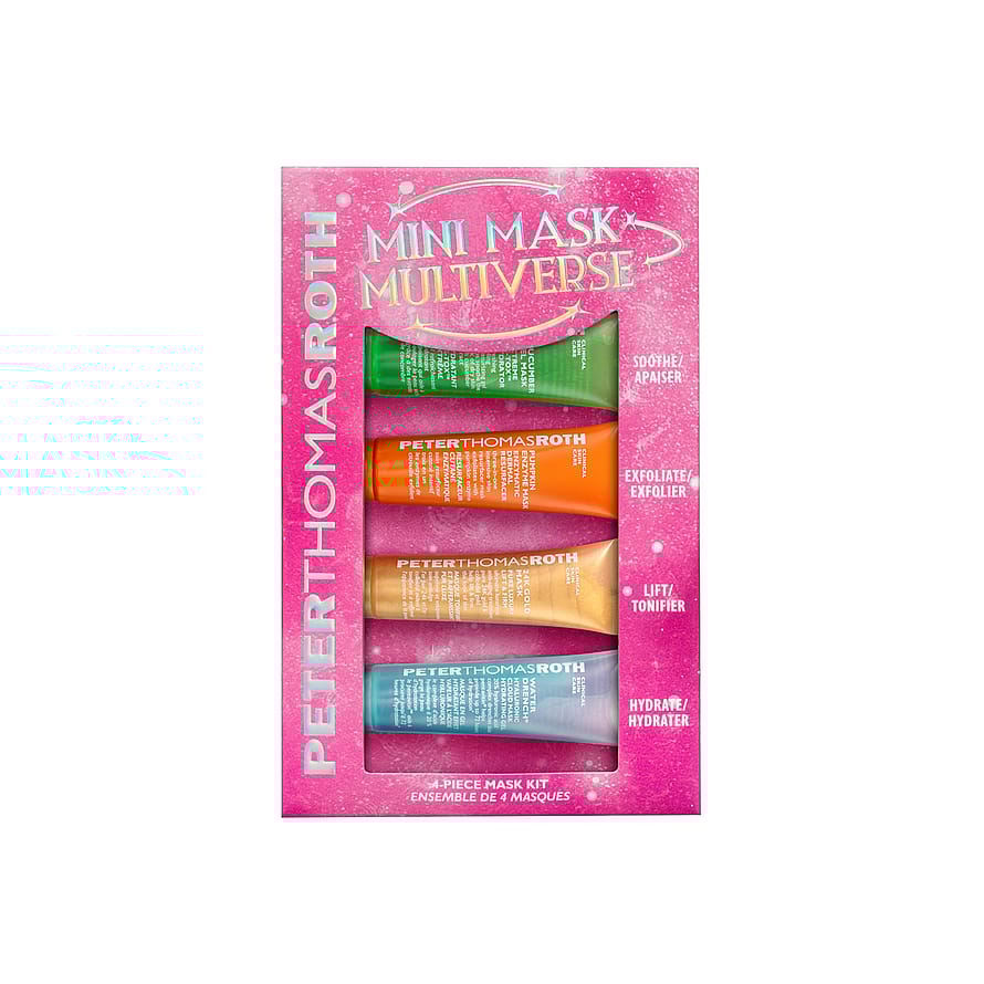 "Mini Mask Multiverse – neljä minikasvonaamiota sisältävä setti, jonka avulla tutustut Peter Thomas Rothin kuuluisaan ihonhoitoon. Tuotteet rauhoittavat, silottavat, heleyttävät ja kosteuttavat ihoa. Voit ottaa setin matkalle mukaan: tee multimasking ja täytä ihon erilaiset tarpeet minikokoisilla kasvonaamioilla Cucumber Gel Mask Extreme De-Tox™ Hydrator, Pumpkin Enzyme Mask Enzymatic Dermal Resurfacer, 24K Gold Mask Pure Luxury Lift & Firm och Water Drench® Hyaluronic Cloud Mask Hydrating Gel.