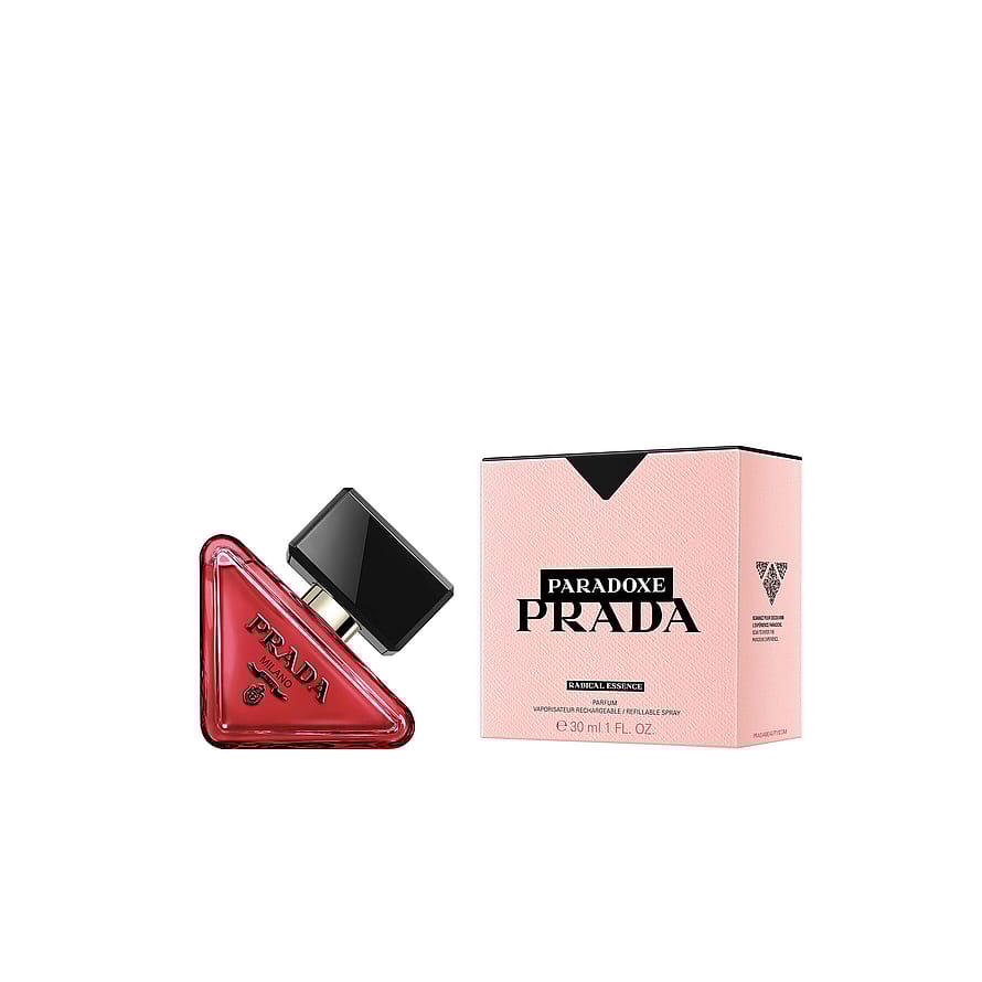 Kuten alkuperäinen tuoksu, uudistettu pullo on ilmentymä Pradan uudelleen keksimisen ytimestä. Minimalistinen ja herkkä ensi silmäyksellä, inspiroitunut alkuperäisestä ikonisesta Prada-kolmiologosta, joka on suunniteltu lepäämään kyljellään. Pradan vaakuna on kontrastina pullon hienostuneelle, syvän vaaleanpunaiselle lakkaukselle. Paradoxe Radical Essence -ulkopakkaus on kohokuvioitu heijastamaan tuotemerkin Saffiano-nahkaa. Vuorovaikutus tuoksun vaaleanpunaisen ja mustan Prada-logon välillä kiertää Paradoxe-etiketit mustaksi heijastaen tämän radikaalin olemuksen maksimaalista intensiteettiä.