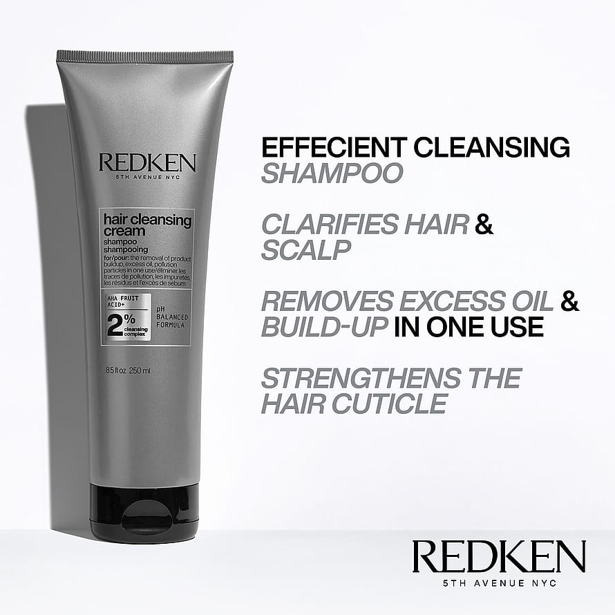 Redken Hair Cleansing Cream on puhdistava shampoo kaikille hiustyypeille ja -tekstuureille. Se poistaa kuivashampoon ja muiden tuotteiden, kovasta vedestä peräisin olevien mineraalien, ylimääräisen rasvaisuuden ja saastehiukkasten kertymiä hiuksista – kaikki tämä vain yhdessä tuotteessa. Tämä shampoo sisältää hedelmähappoja ja se vahvistaa hiusta sekä antaa lisää kiiltoa.