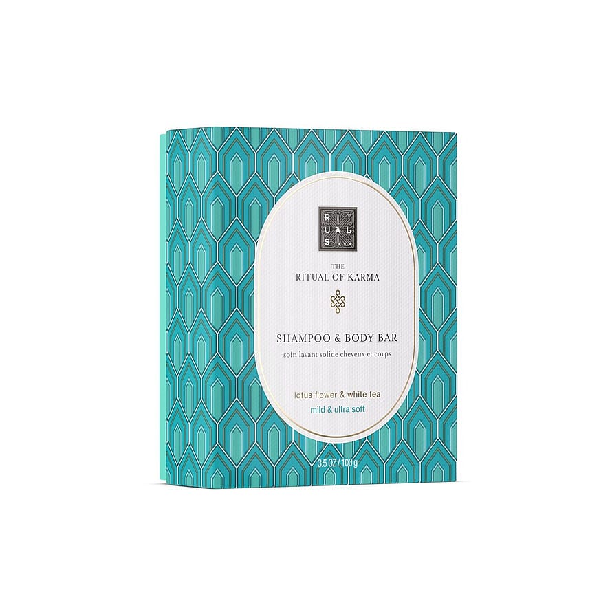 Esittelyssä The Ritual of Karma Beauty Bar, ylellinen puhdistuspala vartalolle ja hiuksille. Tuotteen erittäin täyteläisen ja pehmeän koostumuksen ainesosista 91 % on luonnollista alkuperää, ja sen hellävarainen vaahto puhdistaa tehokkaasti lian ja epäpuhtaudet ihoa ja hiuksia kuivattamatta. Tämä saippuaton palamuotoinen puhdistusaine on kevyesti hajustettu kuuluisalla lootuksen kukan ja valkoisen teen tuoksullamme, ja se sisältää tasapainoisen yhdistelmän ainesosia, jotka auttavat kosteuttamaan ihoa ja hiuksia. Tehokkaasti kosteuttavasta vaikutuksestaan tunnettu skvalaani auttaa tunnetusti palauttamaan ihon lipidisuojakerrosta, kimmoisuutta ja elastisuutta. Aloe on puolestaan tehokas ainesosa, joka auttaa parantamaan ihon kosteutusta ja rauhoittamaan ihoa auringolle altistumisen jälkeen, ja levä taas auttaa parantamaan ihon kosteutusta ja vähentämään veden menetystä.