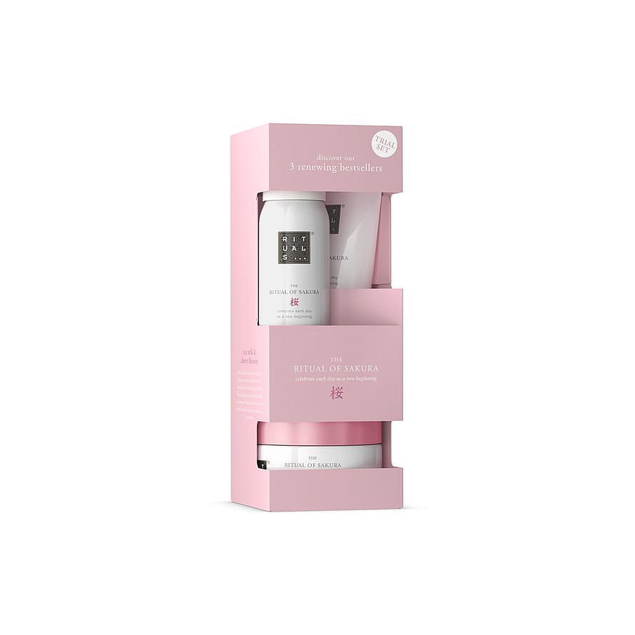 The Ritual of Sakura -pakkaus on täydellinen tapa tutustua Rituals-tuotteisiin, ja se on loistava lahja läheiselle tai itselle. Pakkaus sisältää kolme tuotesarjan myyntisuosikkia: vaahtoavan suihkugeelin, olevan vartalovoiteen sekä alkuperää olevan sokerikuorinnan. Kaikissa tuotteissa on kirsikankukan ja ravitsevan riisimaitouutteen uudistava tuoksu.