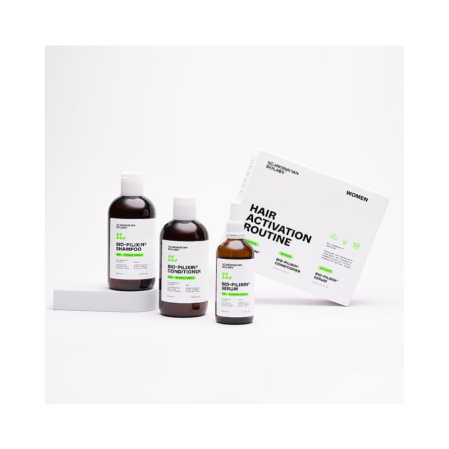 Ennenaikaista hiustenlähtöä ehkäisevä ja hiusten kasvua edistävä hiustenhoitosetti miehille. Scandinavian Biolabs Bio-Pilixin® Hair Routine For Women sisältää shampoon, hoitoaineen ja hiuspohjan seerumin, jotka edistävät hiusten kasvua ja vahvistavat hiuksia. Dermatologisesti testattu. Kehitetty ja valmistettu Tanskassa.
