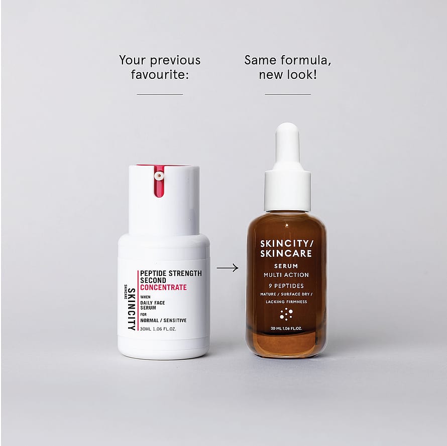 Tuote on saanut uuden nimen ja ulkoasun, mutta siinä on sama upea sisältö. Multi Action Serum oli aiemmin nimeltään Peptide Strenght Second Concentrate. Ainutlaatuinen seerumi, joka sisältää 9 eri peptidiä, jotka toimivat ihossa eri tavoin. Sopii moniin eri iho-ongelmiin, kuten kosteusköyhälle iholle, epätasaiseen ihon sävyyn, hyperpigmentaatioon, elastisuuden puutteeseen, juonteisiin ja ryppyihin. Peptidit ovat pieniä ainesosia, jotka kommunikoivat solujen välillä, ja ne ovat yksiä tärkeimpiä läpimurtoja kosmetiikassa. Tehokkaat aminohapot auttavat ihosoluja käyttäytymään kuten nuoret solut, vahvistaen niiden luonnollista korjauskykyä. Yhdessä antioksidanttien ja kahden eri hyaluronihappomuodon kanssa seerumista tulee täydellisen monivaikutteinen tuote päivittäiseen käyttöön. Nopeasti imeytyvä ja samettinen koostumus. Dermatologisesti testattu herkällä iholla. Seerumi, joka sisältää 9 eri peptidiä Tasoittaa ihon sävyä sekä häivyttää hyperpigmentaatiota ja juonteita Auttaa ihoa säilyttämään kosteustasapainon