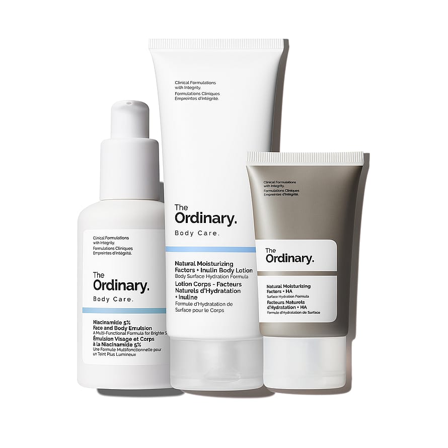 Näin tuote toimii: Niacinamide 5% Face and Body Emulsion (täysikokoinen) on monikäyttöinen emulsio, joka auttaa vähentämään tummien läiskien näkyvyyttä kasvoissa ja vartalolla tasaisemman ihonsävyn saavuttamiseksi. Testattu kaikilla ihonsävyillä. Se antaa kohdennettua hoitoa alueille, joilla ihonsävyn epätasaisuutta usein esiintyy - kasvoille, kaulalle, rintakehälle ja käsivarsille. Natural Moisturizing Factors + Inulin Body Lotion on kevyt vartalovoide kaikille ihotyypeille, joka on suunniteltu pitämään ihon kosteutettuna pesun jälkeen. Lotion-koostumus kosteuttaa välittömästi koko päivän ajan ja auttaa vahvistamaan ihon suojakerrosta jo yhden levityskerran jälkeen. Natural Moisturizing Factors + HA: Päivittäinen kasvojen kosteusvoide kaikille ihotyypeille – vahvistaa ihon suojakerrosta ja tarjoaa pitkäkestoista kosteutusta.