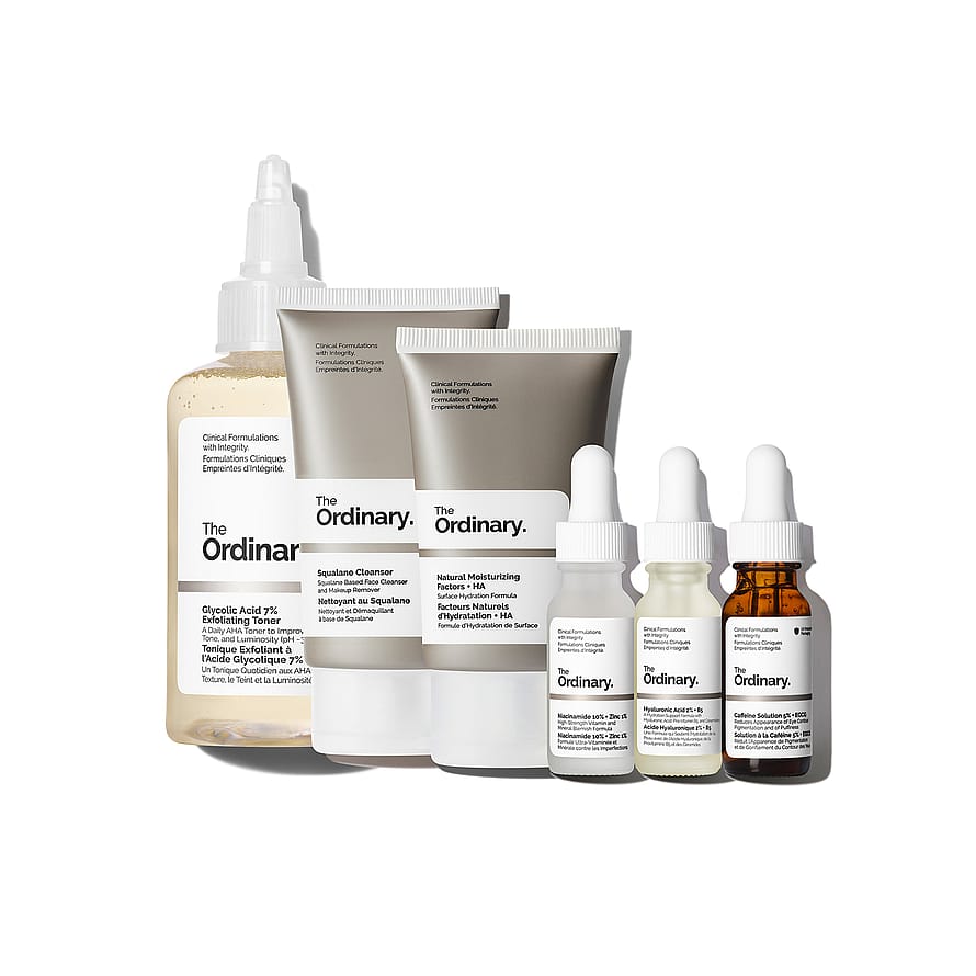 Puhdista kasvot aamuisin ja iltaisin Squalane Cleanser -puhdistusaineella ja käytä sen jälkeen iltaisin Glycolic Acid 7% Exfoliating Toner -hoitovettä. Levitä puhdistamisen ja hoitoveden jälkeen iholle muutama tippa Niacinamide 10% + Zinc 1% -seerumia. Kun seerumi on kuivunut, levitä iholle muutama tippa Hyaluronic Acid 2% + B5 -seerumia. Levitä pieni määrä Caffeine Solution 5% + EGCG -silmänympärysseerumia silmien ympärille ja viimeistele pienellä määrällä Natural Moisturizing Factors + HA -kosteuttavaa päivävoidetta.