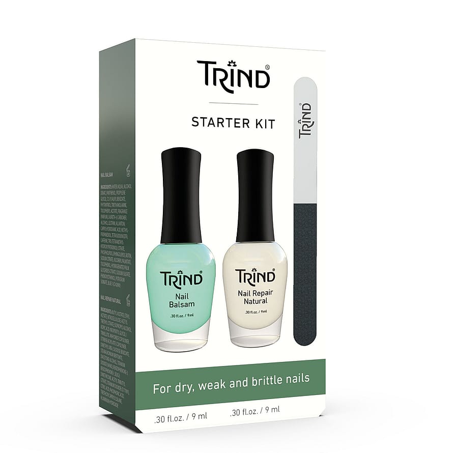 Aloituspakkaus kuiville, heikoille ja ohuille kynsille. TRIND Start Kit -aloituspakkaus: Hyväkuntoiset ja kestävät kynnet vain kahdessa viikossa. 1. Trind Nail Magic Buffer -viila Tasoittaa, kiillottaa ja hieroo. Stimuloi kynnen kasvua. Käytä viilaa kerran viikossa 4 viikon ajan. 2. Trind Nail Balsam -kynsibalsami on ainutlaatuinen, vesipohjainen hoitotuote kuivien ja katkeilevien kynsien ravitsemiseen. Palauttaa kynsien luonnollisen kosteustasapainon. Käytetään yhdessä Trind Nail Repair -tuotteen kanssa parhaan tuloksen saavuttamiseksi. 3. Trind Nail Repair Ainutlaatuinen ja tehokas kynnenvahvistaja luo täydellisen tasapainon kynnen luonnollisen keratiini- ja kosteuspitoisuuden välille. Kynsistä tulee vahvat, mutta joustavat.