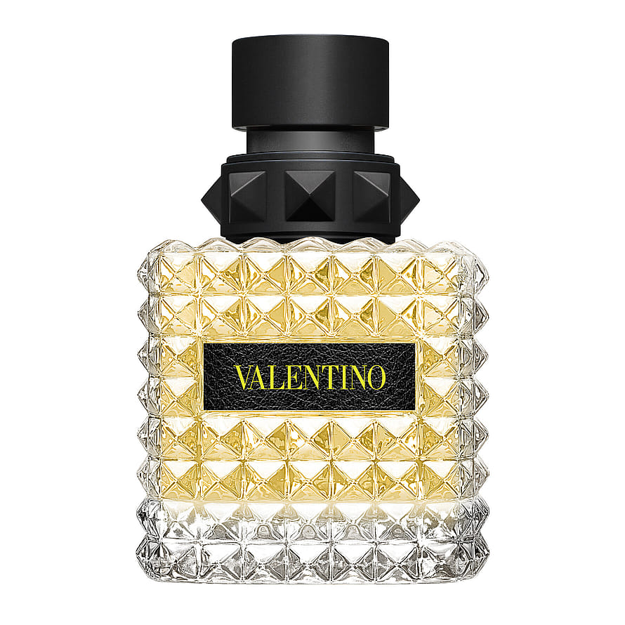 Pulloa koristavat ikoniset Valentino rockstud -niitit – roomalaisen arkkitehtuurin inspiroima pieni pyramidimuoto antaa klassiselle designille särmää. Pullo on moniulotteinen, ja sitä koristaa energinen neonkeltainen signeeraus.
