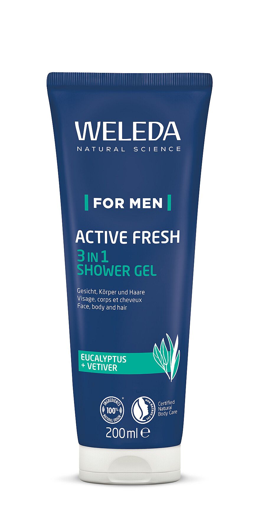 3 in 1 suihkugeeli iholle, hiuksille ja kasvoille. Puhdistaa tehokkaasti kuivattamatta ihoa. Virkistävä tunne eukalyptuksen ja vetiverin luonnollisilla tuoksuilla. 100 % luonnollista alkuperää olevat ainesosat. Dermatologisesti testattu.