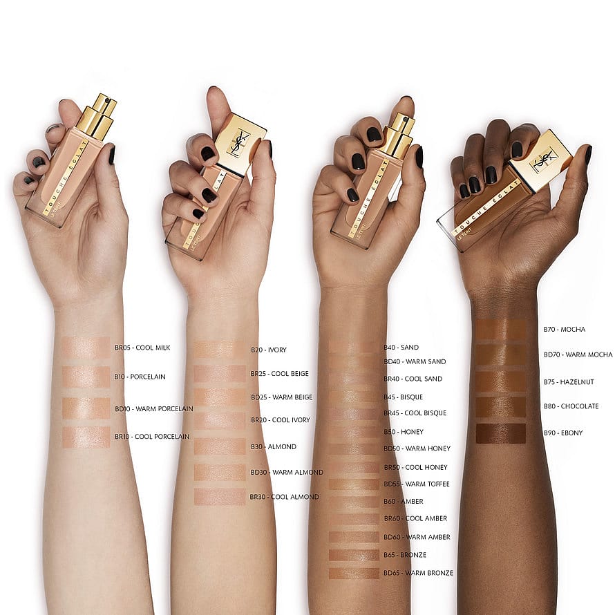 Yves Saint Laurent Touche Éclat Le Teint Foundation on Glow Liquid Foundation -meikkivoide, joka kosteuttaa, antaa keskitasoisen peittävyyden 24 tunniksi sekä miellyttävän, hengittävän tunnun iholle. YSL Touche Eclat Le Teint sisältää kehäkukka- ja salkoruusu-uutetta sekä E-vitamiinia. Koostumus antaa iholle optisesti virheettömän, hyvinvoivan ja luonnollisen hehkuvan ulkonäön ilman kompromisseja.