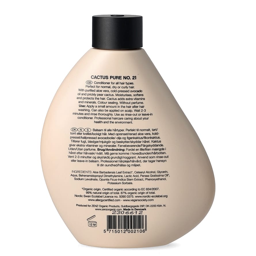Hoitoaine Cactus Pure nro 21 antaa kosteutta, voimaa ja hoitoa kaikille hiustyypeille. Se sopii hyvin normaaleille, kuiville ja kiharille hiuksille sekä kuivalle päänahalle. Päänahka ja hiustupet vahvistuvat, ja hiuksista tulee terveet, kiiltävät ja helposti kammattavat. Hoitoaine rikastuttaa hiuksia ja hiuspohjaa vitamiineilla ja kivennäisaineilla ja lisää runsaasti kosteutta ja hoitoa. Se peittää jokaisen hiuslangan ja täyden vaikutuksen saavuttamiseksi sitä voidaan käyttää myös hiuspohjassa, sillä se on silikoniton. Se on värisulkeva ja sitä voidaan käyttää tavallisena hoitoaineena, joka huuhdellaan pois, tai jätettävänä hoitoaineena.